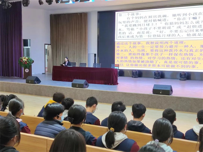 成主任以“父子住山上,下山卖柴”“观音与常人躲雨”“阿姆特斯特朗”三则故事,与学生互动。让学生从中明确:养成良好习惯、不要把希望寄托在他人身上、热情自信面对生活、乐于分享不放弃的重要性。
