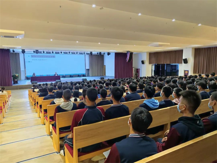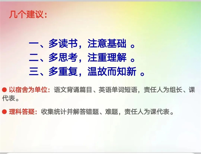 同时,为了让学生树立高中校园生活自信心。成主任从四个方面切入:第一、做好准备,调整自我,尽快适应新环境,迎接高中生活挑战;第二、树立远大理想,做一名优秀的高中学生;第三、勤奋学习,珍惜时间,学好文化知识,提高全方位的能力;第四、不断鞭策自己,不断完善自己。以上四个方面鼓励学生能成为一个专注学习运用五环学习法(预习、听课、作业、复习、总结)的学生。